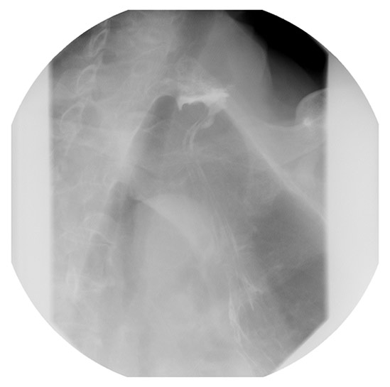 | Figure 4. One year postoperative esophagram showing residual proximal dilatation, but improved transit of contrast through the cervical esophagogastric anastomosis. |