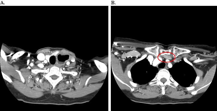 To rule out anastomotic malignant recurrence, a flexible EGD was again performed with fluoroscopic guidance and four quadrant biopsies were taken off the distal cervical esophagus and the proximal gastric conduit. Fluoroscopy confirmed the intraluminal narrowing corresponded to the anatomic location of the left SCJ. The esophageal biopsies revealed squamous epithelium with no evidence of metaplastic, dysplastic, or neoplastic changes and the gastric conduit biopsies were benign as well. Given the absence of recurrent malignancy, the source of the extrinsic compression seen in the imaging of the patient’s cervical esophagogastric anastomosis was secondary to compression by her left SCJ. The patient elected to have the left SCJ resected due to ongoing worsening dysphagia.