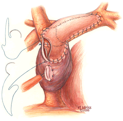 If a hemi-Fontan is performed (Figures 1-6), the venous cannula is removed. A right atriotomy is made beginning in the most superior portion of the atrium and extending onto the medial aspect of the SVC. The pulmonary artery confluence is incised anteriorly and the incision extended from a point medial to the right upper lobe branch leftward to a corresponding site on the left pulmonary artery. If there is antegrade flow across the pulmonary valve, the main pulmonary artery is transected and the valve over-sewn. The right SVC is joined to the right pulmonary artery in a side-to-side anastomosis. When a left SVC is present, it too is opened along its medial side, occluded at the cardiac end, and joined to the left pulmonary artery in a side-to-side anastomosis. A single patch of cryopreserved pulmonary artery homograft tissue is used to augment the branch pulmonary arteries anteriorly, to create a roof over the vena(e) cava(e)-to-pulmonary artery anastomosis(es), and to create a dam occluding flow from the right SVC into the ipsilateral atrium. Prior to creating the dam, the SVC-to-right atrium junction is enlarged to the caliber of the IVC. Following completion of all suture lines, the heart is filled with saline to displace air, the venous cannula replaced into the atrium, and cardiopulmonary bypass resumed.