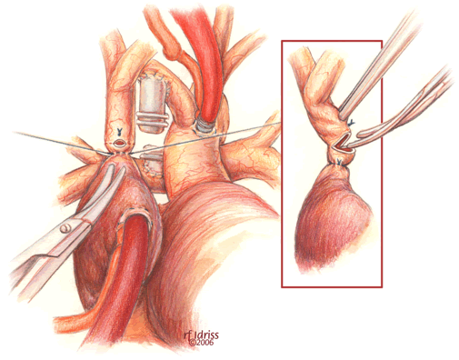 - The suture line between the homograft patch and the posterior wall of the right atrium caudad to the SVC-right atrial junction must be inspected carefully to assess for potential leak spots. Additional interrupted sutures may be necessary to avoid leaving a leak around the homograft dam and resultant systemic venous to pulmonary venous shunt.