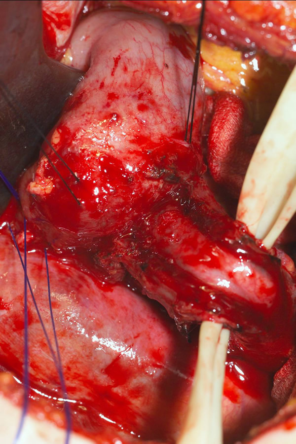 The surgical approach is a left posterolateral thoracotomy, entering the chest over the bed of the unresected 7th or 8th rib. On entering the thoracic cavity, the pulmonary ligament is divided and the lung is packed out of the way superiorly. The epiphrenic diverticulum is often found at the level of the inferior pulmonary vein. The pleura over the esophagus is divided allowing the esophagus to be gently mobilized. Penrose drains are used to encircle the esophagus superior and inferior to the diverticulum to facilitate the dissection (Figure 3). The diverticulum often arises to the right side necessitating rotation of the esophagus to clearly visualize the neck of the diverticulum. The diverticulum and its base are carefully dissected from the adjacent esophagus (Figure 4). Both vagus nerves are clearly identified and preserved during this maneuver. Once the diverticulum base is defined, a 40 Fr bougie is introduced across the gastroesophageal junction. This is performed under direct vision with the surgeon closely monitoring the safe passage of the bougie.