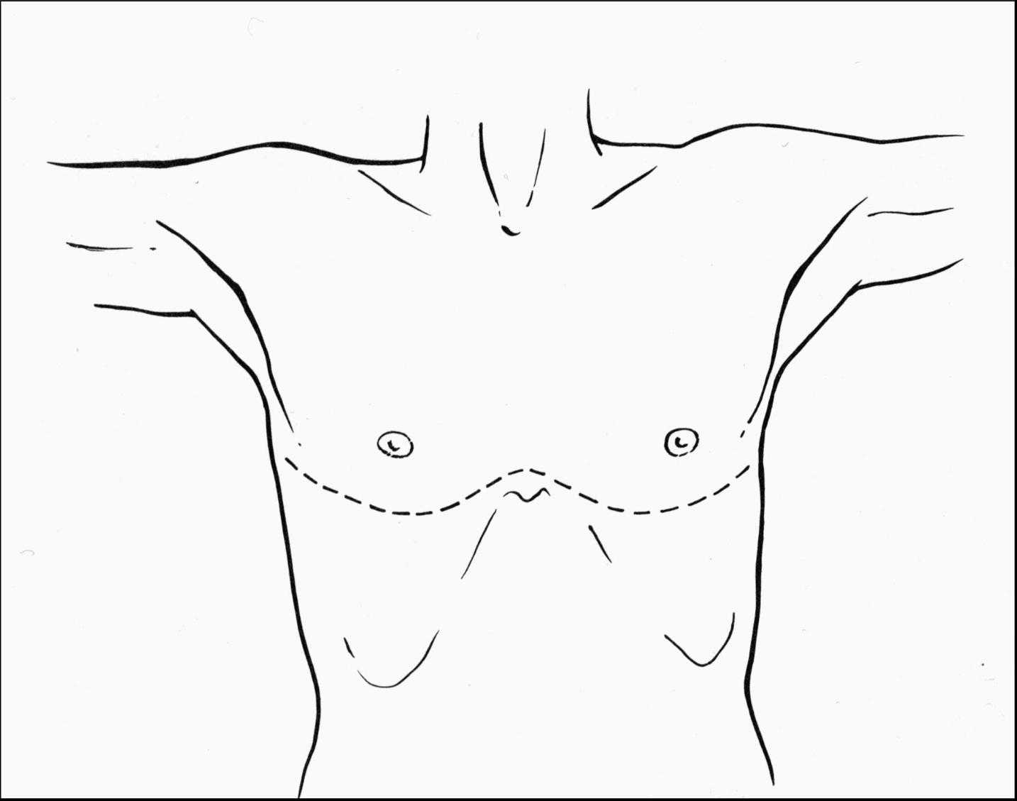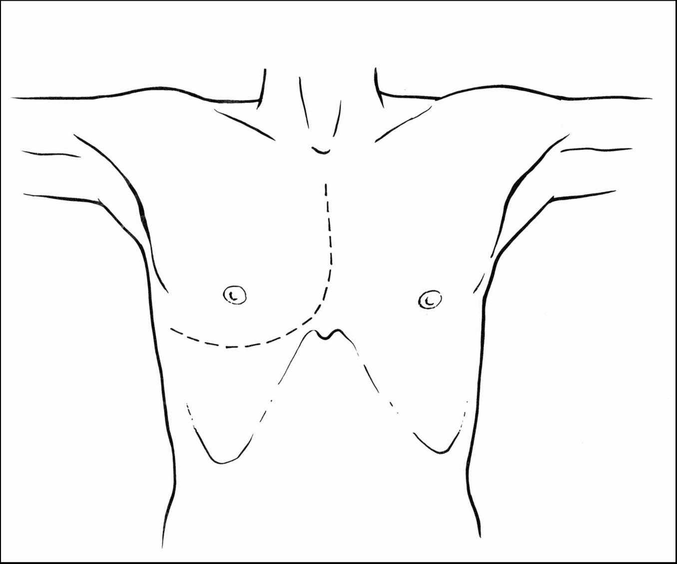 Very large tumors with extension into both hemithoraces are best approached via this method. The patient is placed in the supine position and the arms are either extended or flexed up over the patient’s forehead and secured to the ether screen. A curvilinear incision is made along the inframammary crease, extending from right to left anterior axillary lines (Figure 9). The 4th interspace with transverse division of the sternum usually provides the best exposure; the mammary vessels are ligated and two Finochietto retractors are used to provide retraction (Figures 10, 11). The pleural reflections are incised to gain exposure to the mediastinal structures. If one initially begins with a clamshell incision but finds poor exposure to the superior mediastinum, an upper sternal split may provide added exposure of involved structures.