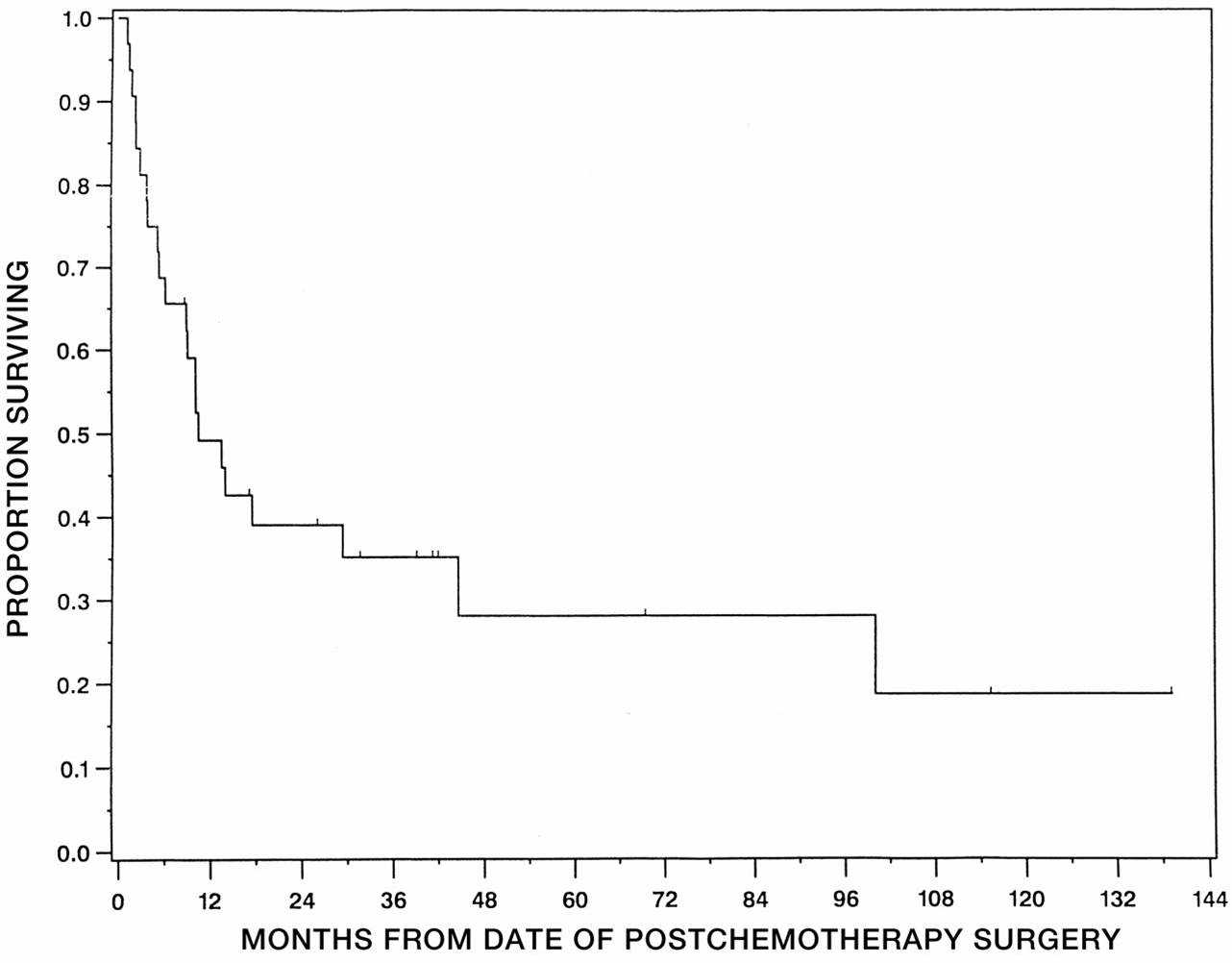 We recently published our series from Memorial Sloan-Kettering of 32 patients who underwent post-chemotherapy surgical resection of mediastinal germ cell tumors [7]. Histologic analysis revealed viable tumor in 66%, teratoma in 22%, and necrosis in 12% of the specimens. Viable tumor included embryonal carcinoma, choriocarcinoma, yolk sac carcinoma, seminoma, and teratoma with malignant transformation to non-germ cell histology (e.g. sarcoma). Since teratoma and residual tumor were found in the majority of resected patients, we maintain an aggressive approach to surgical resection of potentially involved adjacent structures. The Kaplan Meier curve showing the survival of the 32 patients who underwent post-chemotherapy surgery is shown in Figure 12.