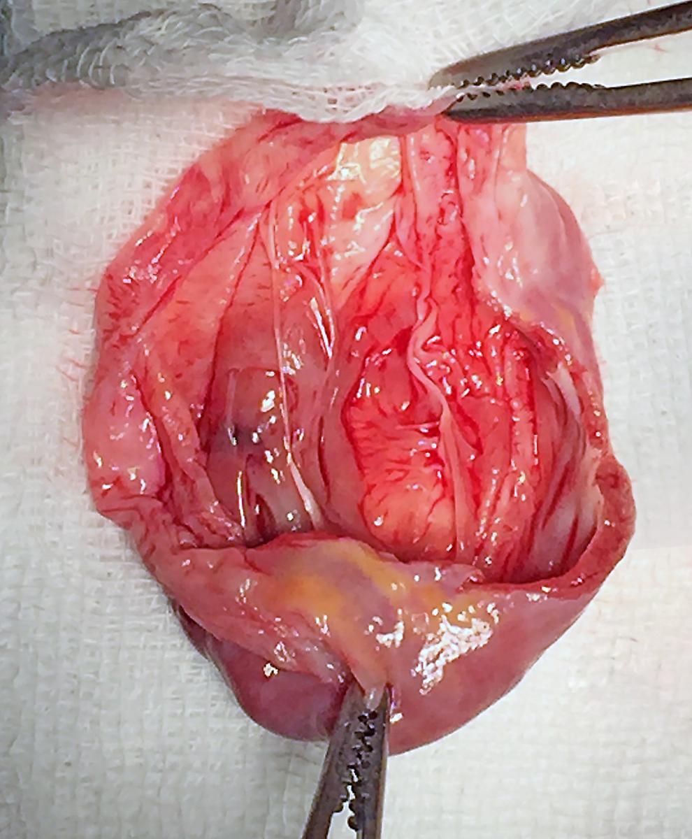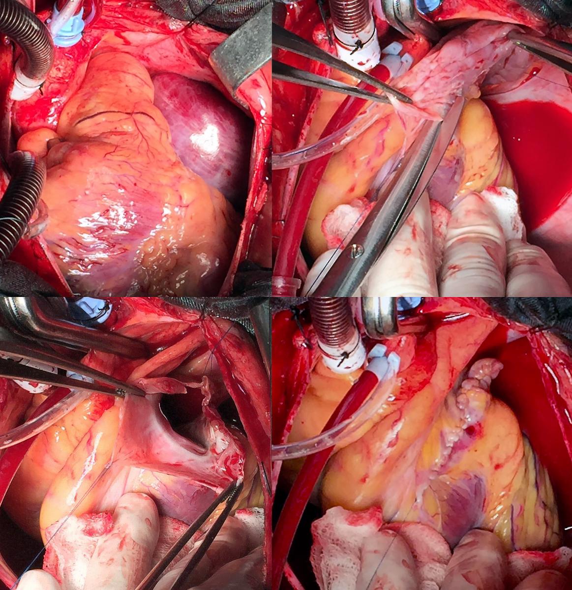 A full median sternotomy was performed. Cardiopulmonary bypass was established with aortic and bicaval cannulations. The giant thin-wall LAAA was exposed with intact overlying pericardium. Aneurysmectomy was performed and no thrombus was found inside (Figure 2). Then, the base of the LAAA was sutured using 5/0 polypropylene (Figure 3). There was no evidence of left circumflex coronary artery injury visualized on intraoperative monitors nor evidence of other cardiac anomalies during the operation.