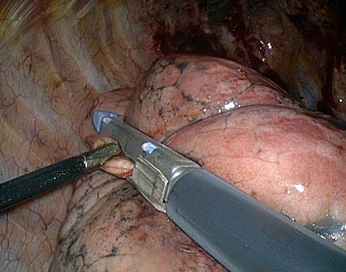 The transverse fissure is rarely complete, thus the parenchyma has to be divided. After having checked that the venous branch to the middle lobe is remote, a clamp is applied on the parenchyma and its correct position is adapted according to the reventilation test. Some pressure is applied on the clamp in order to mark the parenchyma, and then the stapler is applied. One to three 4.8 mm cartridges may be necessary to complete the fissure division. The specimen is retrieved in a bag. After extraction, the pulmonary ligament is freed and the middle lobe is secured.