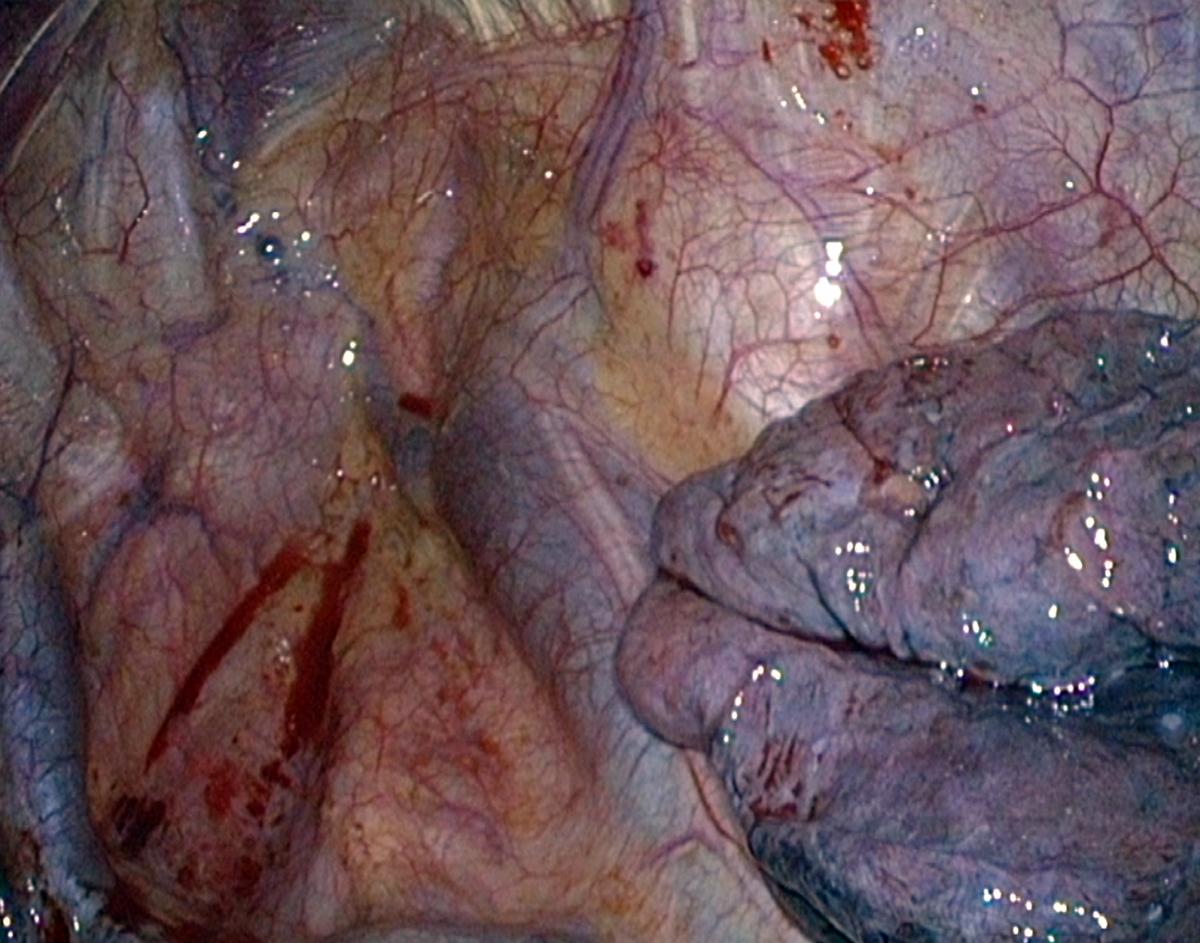 Fig.10: Division of the pulmonary ligament. Note the use of a 3 mm grasping forceps for traction on the