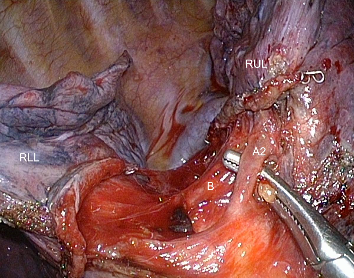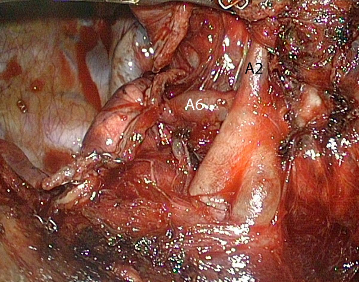 - Completing this approach with division of the fissure without dissection of pulmonary artery can lead to accidental tearing or stapling of an A6 artery when the latter has a common birth with A2 or even arises from A2.