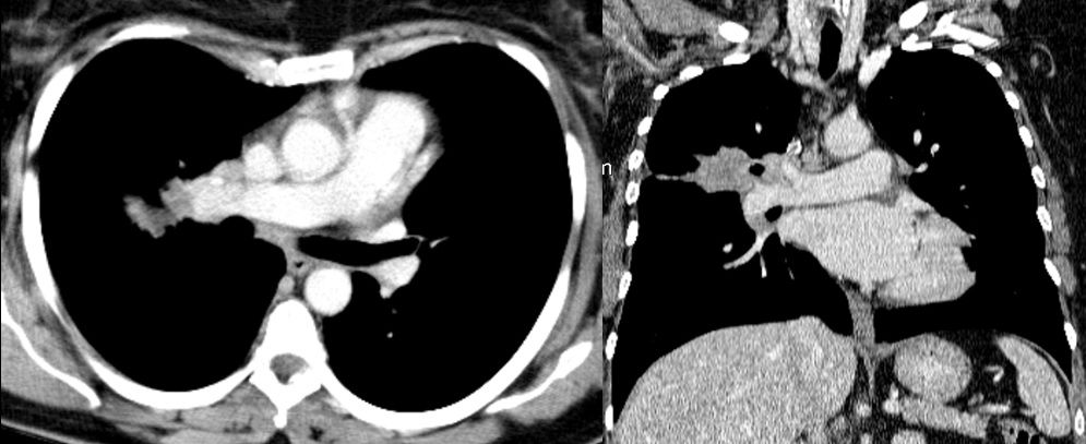 Through a 6 cm incision in the 5th intercostal space, the operating surgeons put a thoracoscopic port in the upper side of the incision, and a wound protector in the lower side. The surgeons assessed the minor fissure, and verified that the tumor invaded the middle lobe. The operating surgeons then proceeded with a right upper and middle bilobectomy. When the dissection of the posterior ascending branch was reached, the operating surgeons ascertained that there was no chance of dividing the arterial vessel because of tumor infiltration at its base. An endostapler was used across the wall of the pulmonary artery to verify there was no kinking or constriction so the distal branches for the lower lobe remained patent. The surgeons completed an exhaustive lymphadenectomy of the interlobar, hilar, paratracheal, subcarinal, and lower levels. The pathologic exam of the specimen revealed an adenocarcinoma of 4 cm, with margins free of tumor. All the lymph nodes were negative.
