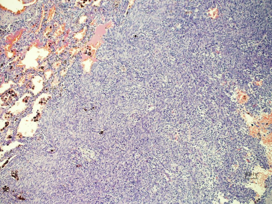 Figure 4. Spindle cells, plasma cells, lymphocytes, foamy macrophages, and hemosiderin-laden macrophages.