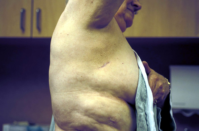 The patient is placed in the lateral decubitus position with the table break maximally-flexed at the patient’s hip level, and then reverse Trendelenburg tilts the table so the patient’s lateral chest wall is parallel to the floor. Figure 2 shows the patient in a suboptimal position where the hip would limit adequate visualization of the hemithorax by obstructing downward movement of the thoracoscope. Figures 3 and 4 demonstrate the same patient in the proper VATS lobe position. Single lung ventilation is established and the camera port is placed at the eighth interspace in the anterior axillary line for right-sided lesions and in the posterior axillary line for left-sided lesions. The posterior port is then placed where the lower lobe edge touches the diaphragm (approximately the 8th interspace). A lung clamp used as a retractor is placed through the posterior port and the upper lobe is retracted laterally to allow visualization of the superior pulmonary vein (Figure 5). The utility incision (no larger than 4 cm in length) is placed directly over the superior pulmonary vein for upper lobectomies (approximately the 3rd or 4th interspace, and one interspace lower for middle and lower lobectomies. A Weitlaner is used to retract the soft tissues; there is no need for rib spreading (Figure 6).