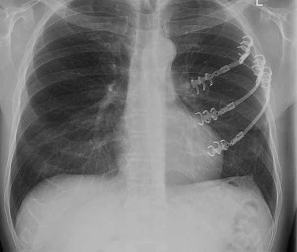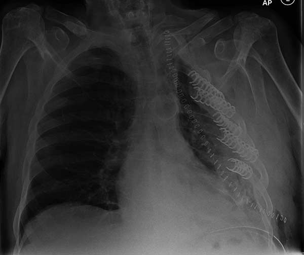| Figure 4: Model showing application in chest wall resection. | Figure 5: Postoperative chest x-ray showing the implants |