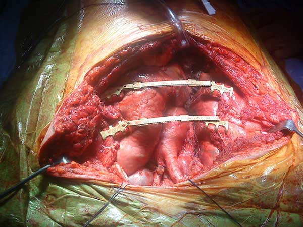 Many different methods have been proposed to stabilize the chest wall after resection. The rigid reconstruction of chest wall defects with GORE-TEX® felt or mesh-cement sandwiches has been widely reported. However, it does not restore normal chest wall mechanics and is vulnerable to catastrophic prosthetic infections. We believe that the application of these newer surgical materials is likely to provide important clinical benefits over established techniques. It is also an advantage that the same techniques can be applied to a number of clinical scenarios. We are particularly interested in their use in massive chest wall trauma, where early restoration of chest wall mechanical integrity may well play a part in reducing respiratory morbidity. We treated 9 patients (4 pectus corrections, 3 chest wall resections for malignancy, 1 flail chest fixation and 1 chronic pain syndrome from rib malunion) with excellent results.