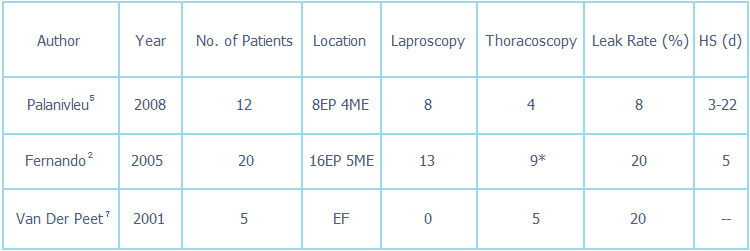 * In 2 of the patients laparoscopy and thoracoscopy was simultaneously used.