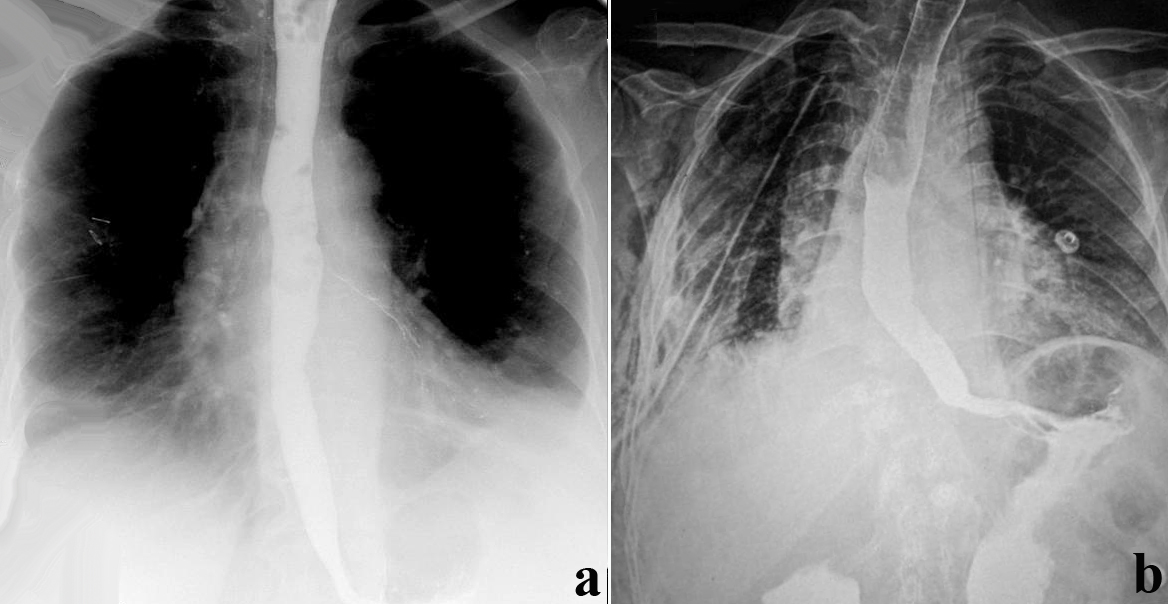 - Figure 4a. Postoperative barium swallow. These patients have motility problems and the thin line of barium in the left main bronchus is a result of microaspiration and not leakage.