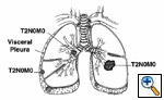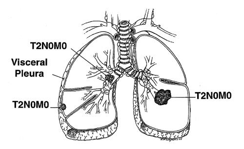 Diagram, stage IB. Patients with T2 primary tumors and no evidence of lymph node metastasis, the T2 N0 M0 subset, are assigned to stage IB.
