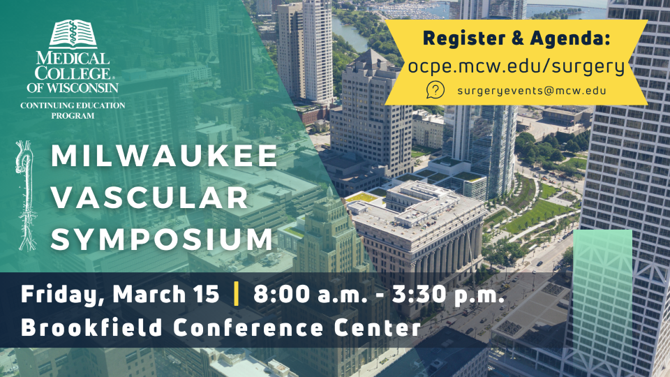 The Medical College of Wisconsin Department of Surgery presents the Milwaukee Vascular Symposium on March 15, 2024, from 8:00 a.m. – 3:30 p.m. at the Brookfield Conference Center. This educational symposium will highlight a broad range of topics relating to vascular disease. It will familiarize the audience with natural history, surgical techniques, avoidance of complications and new technology. Speakers include MCW faculty experts and invited speaker Patrick E. Muck, MD (Chief of Vascular Surgery, TriHealth Good Samaritan Hospital). Visit https://ocpe.mcw.edu/surgery for registration and agenda.