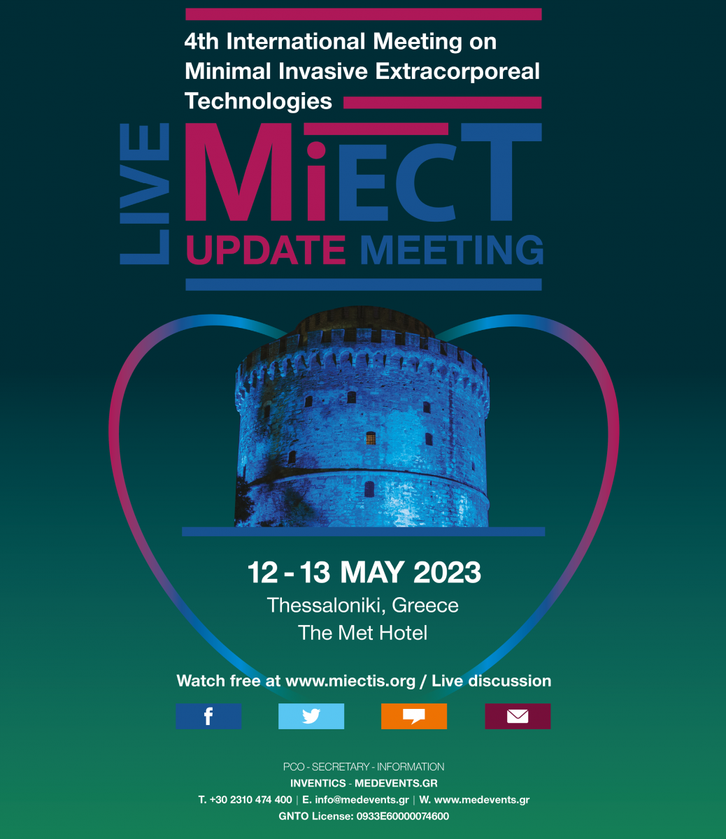 The Fourth International Meeting on Minimal Invasive Extracorporeal Technologies (MiECT) will be held May 12–13, 2023 at The Met Hotel in Thessaloniki, Greece. Organized by MiECTiS, the free meeting registration includes participation to the meeting, typical refreshments, and a certificate of attendance. Furthermore, the meeting will be livestreamed for free to those who cannot attend by Livemedia and on CTSNet's YouTube channel.