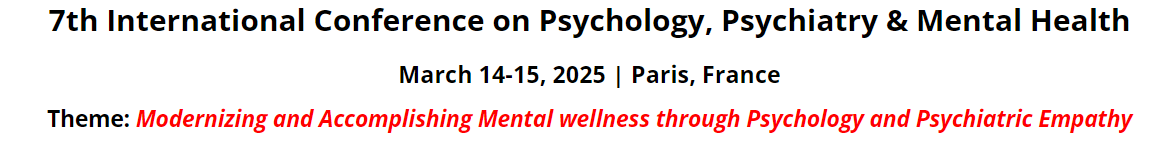 Scientific Meditech Conferences invites all the participants from all over the world to attend the 7th International Conference on Psychology, Psychiatry & Mental Health during March 14-15, 2025 | Paris, France with the Theme: Modernizing and Accomplishing Mental wellness through Psychology and Psychiatric Empathy ,which includes keynote presentations, Oral talks, Poster Presentations and Exhibitions.