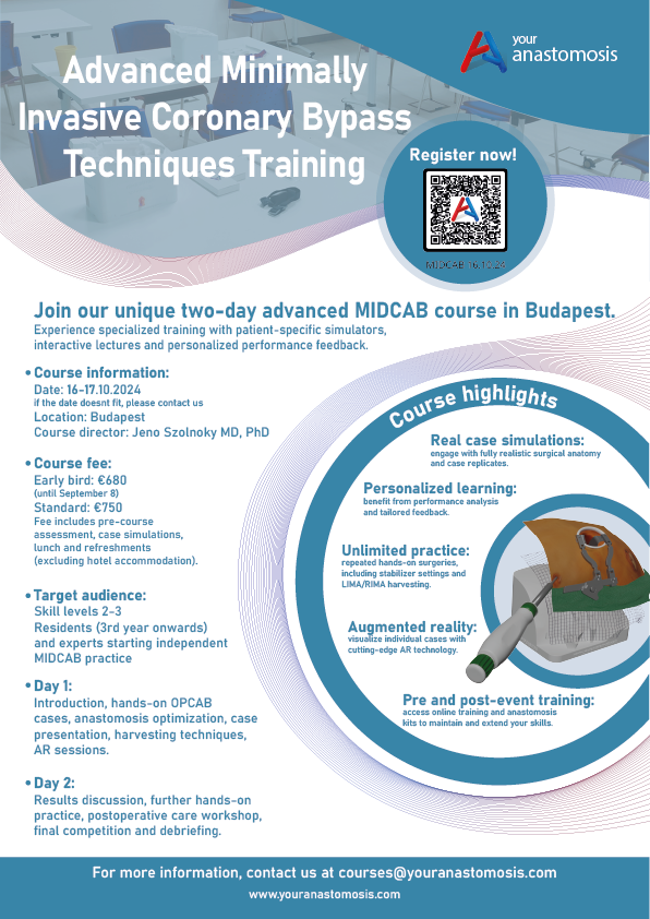 This two-day, hands-on workshop focuses on the technical aspects and intricacies of MIDCAB surgery, offering participants an immersive experience with 3D-printed, case-specific simulators enhanced by augmented reality. Attendees will have unlimited opportunities to practice and refine their skills, receiving personalized, predictive feedback through continuous morphological and functional assessments. Anastomoses are evaluated and scored using machine learning, and functional assessments are performed with high-resolution 3D virtual models and in-silico computational blood-flow analysis. Participants can access their scores and detailed evaluations through their user accounts.