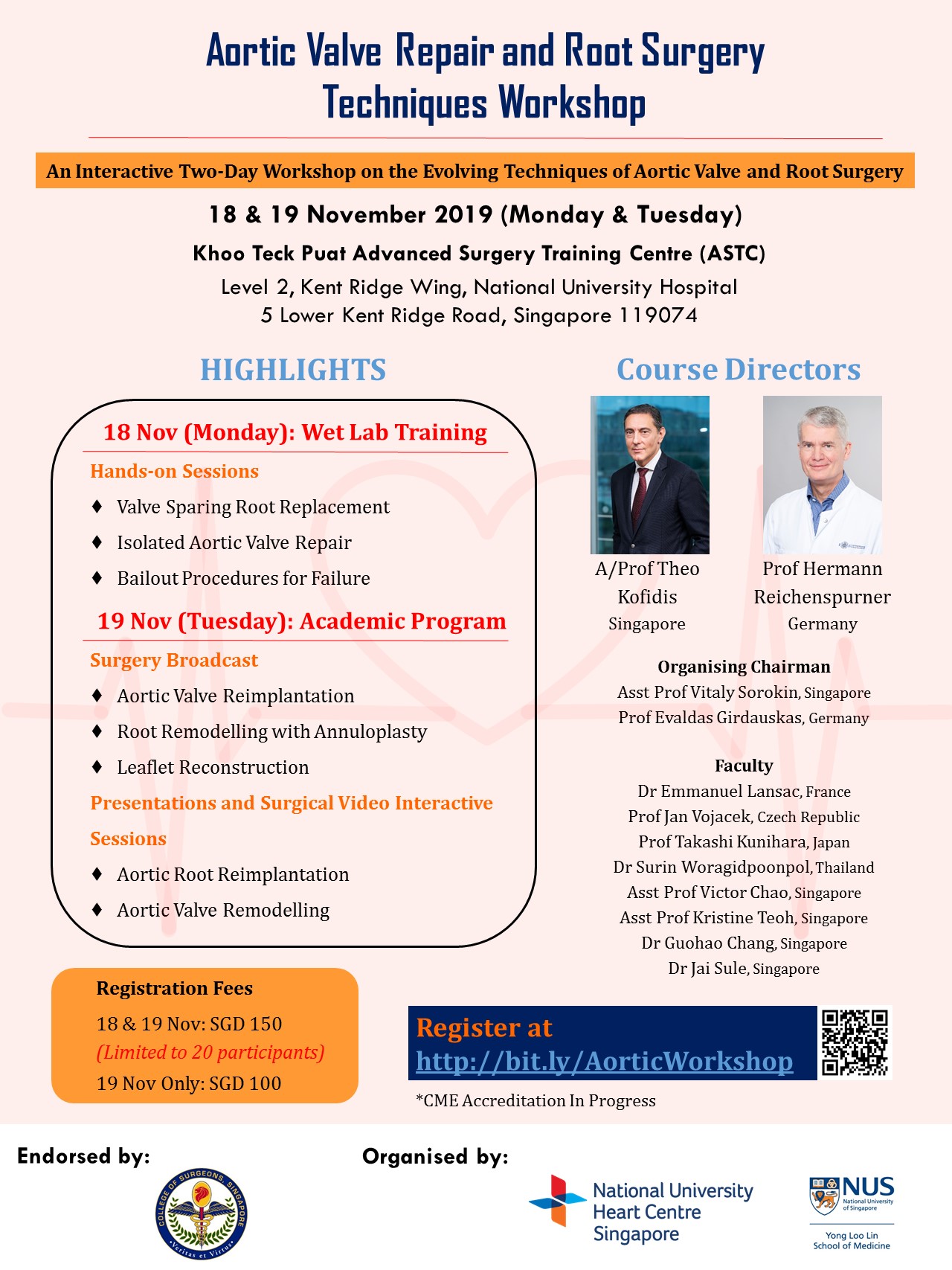An Interactive Two-Day Workshop on the Evolving Techniques of Aortic Valve and Root Surgery Program Highlights: 18 Nov (Monday): Wet Lab Training Hands-on Sessions - Valve Sparing Root Replacement - Isolated Aortic Valve Repair - Bailout Procedures for Failure 19 Nov (Tuesday): Academic Program Surgery Broadcast - Aortic Valve Reimplantation - Root Remodelling with Annuloplasty - Leaflet Reconstruction Presentations and Surgical Video Interactive Sessions -Aortic Root Reimplantation -Aortic Valve Remodelling Registration and Information Link: http://bit.ly/AorticWorkshop