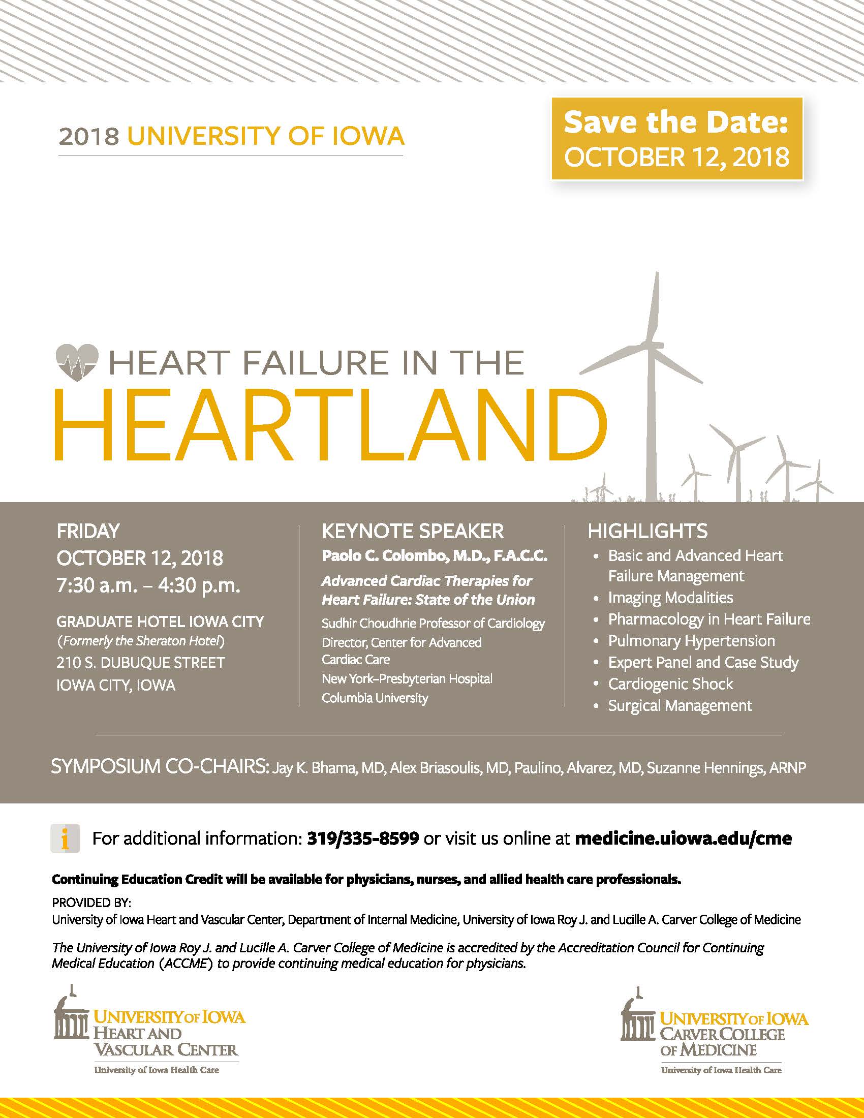 For more information or to register, go to: Heart Failure in the Heartland 2018 or https://medicine.uiowa.edu/cme/ (click or copy and paste into your web browser) and click on Upcoming Programs.