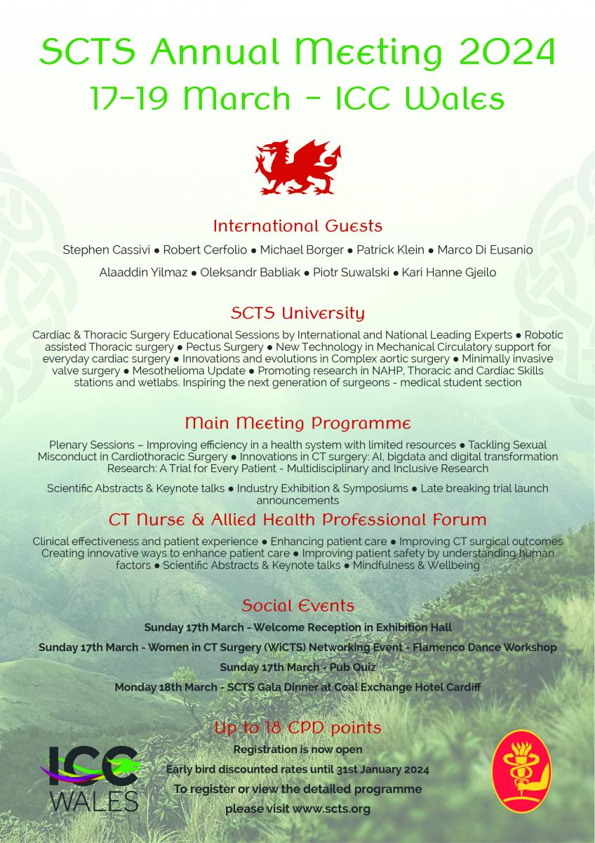Join this year's SCTS Annual Meeting, taking place Sunday, March 17 to Tuesday, March 19 in the International Convention Centre (ICC) Wales. The conference's early bird registration pricing has been extended until February 14th. Be sure to take advantage of the reduced consultant, trainee, nursing, and discounted rates!