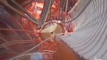 All sutures were passed through the bioprosthetic aortic valve. The valve was slid down and tied in place. Careful attention was paid to make sure that the valve was well-seated as it was tied down. The valve was then inspected. The enlarged area is marked clearly with an arrow in the video above. The right and the left coronary arteries were patent, and the patch was sutured to the remaining part of the aortic valve. Then the patch was teared in a tear-shaped fashion to complete the closure of the aortotomy. The stich was started from the other side of the aortotomy to incorporate both sides of the patch into the aortotomy closure, as illustrated in the video.