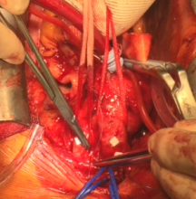 The AV Flow can be introduced before the institution of HCA and before opening the aortic arch. One great advantage to this technique is that the ostia of the SAV remains free from a cannula, allowing the operator easier access and a faster anastomosis or reimplantation.