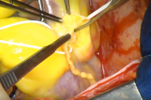 Coronary artery bypass target vessels were the right coronary artery (RCA), the left anterior descending artery (LAD), and the obtuse marginal artery (OM2). All three vessels were sub-totally occluded (<1.25 mm). Traction-CEA was performed to the RCA, LAD, and OM2 to achieve complete myocardial revascularization. Flushing the coronary vessel with cardioplegia and proximal/distal vessel massaging were both done to get rid of residual debris after CEA in order to avoid early failure. Intraoperative transit time flow measurement reported high flows and a low pulsatility index (PI).