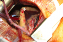 A 62-year-old patient presented to the community hospital with an incident of stroke and resulting dysphasia. Following a cardiac screening for the source of the event, a large 3x5 cm, pedunculated, and largely mobile left atrial mass was detected by 2D echocardiography. The patient was scheduled for surgery soon after the mass was discovered. Three days prior to surgery, another stroke occurred with worsening dysphasia and speech incongruence. The authors made the decision to operate on the patient immediately. Routine preoperative angiography revealed a 70% stenosis of the mid-portion of the right coronary artery (RCA), and right dominant pattern. The procedure was planned in a minimally invasive fashion via right minithoracotomy.