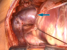 The patient was taken electively to the operating room. After full median sternotomy, the vertical vein was dissected free. After heparinization, bicaval cannulation was performed. During cooling to mild hypothermia, the pulmonary venous confluence posterior to the left atrium was dissected free. The aortic X–clamp was applied, and low-volume crystalloid cardioplegia solution was given with immediate cardiac arrest.