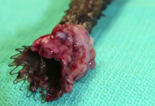 [4]Figure 1: Esophageal stent after removal. Portions of the esophagus wall grew into the uncovered portion of the stent.