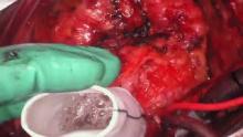 The pulmonary autograft was then harvested on a beating heart and was placed inside a 28mm Valsalva graft. Then the aorta was cross-clamped, so as the jump graft proximal to its cannulation site. Next, the aortic bioprosthesis was explanted after harvesting both coronary arterial buttons. Because of a size mismatch with the LVOT, a mini-Konno incision was created. The reinforced autograft was secured to the LVOT using running three 4-0 polypropylene sutures. This was followed by reimplantation of the left coronary button. The distal pulmonary homograft (25mm in the current case) showed anastomosis to the native pulmonary bifurcation using a running 6-0 polypropylene suture. The posterior suture line of the distal aortic/autograft anastomosis was reconstructed, followed by reimplantation of the right coronary button. We used a 14mm Gelweave graft to reconstruct a new proximal ascending-to-descending bypass graft. This was sutured to the autograft/native distal aortic anastomosis. The heart was then de-aired, and the aortic cross-clamp was removed. The new 14mm graft was then tailored and sutured to the remaining portion of the previous aortic jump graft.