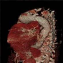 - Thorax CT angiogram with 3-D reconstruction, which is invaluable in the assessment of these patients. Attention must be paid to the detailed arch anatomy, taking note of any anomalies (eg. anomalous vertebral artery, bovine aortic arch), the diameter of the aorta distal to the LSCA, extent and diameter of the descending aorta aneurysm, and the diameter of the expected landing zone. Furthermore, the extent of atheroma/aortic calcification should be evaluated.