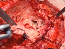 The patient presented years later with recurrent bacterial endocarditis with an aortic root abscess and valve vegetation. The procedure in the video highlights the use of a divided homograft: the distal aspect to replace the infected previous hemiarch graft, and the proximal homograft root to replace the infected bio-Bentall. To unite the two separated ends of the homograft, a handmade pericardial tube was created and utilized to replace the ascending aorta.