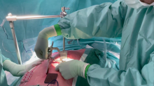 The surgeons began by harvesting the distal part of the LIMA for two important reasons: First, to reduce tension on the LIMA when applying the rib retractor, and second, because harvesting the distal part after using the retractor can be rather arduous. The Fehling retractor for MIDCAB contains a number of components to facilitate all steps of the procedure. The surgeons then switched to the Fehling retractor tool dedicated to internal mammary artery harvesting.