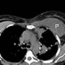 [3]A. CT thorax showing the right implant in situ and the left implant capsule filled with pleural fluid (P).