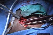 - The common femoral artery and common femoral vein are exposed surgically and are cannulated by means of the Seldinger technique, using a 21F cannula for arterial cannulation and a 30-32F cannula for venous cannulation (Fig. 1).