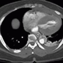 [3]Figure 1a. Axial CT at level of the pulmonary artery. The false lumen in the ascending aorta (white arrow) has minimal flow.