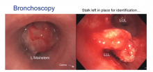 A 34-year-old welder presented with a two- to three-year history of wheezing with progressive shortness of breath requiring multiple visits to the emergency room. The preliminary evaluation included a computed tomography scan and flexible bronchoscopy, which demonstrated a lumen-obstructing mass at the LC2 carina with complete left lower lobe collapse. He underwent a bronchoscopic debulking of the tumor with pathology consistent with a carcinoid. A 68Ga DOTA-TATE scan did not demonstrate any distant metastatic disease. The patient underwent a video-assisted thoracoscopic resection of the left superior segment of the lower lobe, resection of the left LC2 carina, and bronchoplasty with pleural flap buttressing. Bronchoscopic guidance was employed during the surgery to optimize resection.