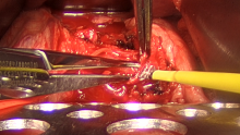 The crus of the diaphragm was very soft and pliable and was spared. As before, all the adjacent inflamed lymphatic and neural tissues were excised from this area using harmonic energy. Dissection and removal of inflamed tissue then progressed back to the spine on both sides of the aorta. The celiac ganglion did not appear to be involved in the compression process.