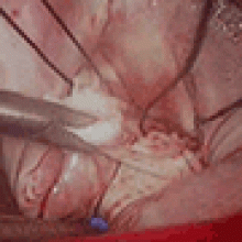 A quadrangular resection of the posterior leaflet is performed in conjunction with a mitral valve annuloplasty. Cannulation is via the femoral artery and femoral vein. A direct aortic cross-clamp is used in conjunction with antegrade and retrograde cardioplegia for myocardial protection.