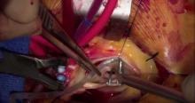A minimally invasive approach was performed through a 6 cm skin incision and an upper partial sternotomy, with extension to the third right intercostal space. The evaluation of the aortic valve showed prolapse of the conjoined left and right leaflets with vegetations on the undersurface of the leaflet. The noncoronary leaflet had vegetations and a perforation. All vegetations were excised, and the perforation was cleaned and closed with a piece of Xenograft pericardium. The conjoint leaflets and noncoronary cusp were plicated on the free edge for an effective height of 9 mm. The root was circumferentially mobilized and a Teflon felt ring was placed underneath the coronaries to create an atrioventricular junction of 25 mm. TEE showed trace aortic valve insufficiency. The patient had an uneventful hospital course.