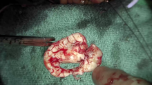 He then removed the leaflets and discussed the merits of removing the chords of the leaflets prior to removing all the chords. The mitral valve was then replaced with an Epic Plus biological valve, whose struts protrude less into the ventricle. Finally, the left atrial appendage was stapled.