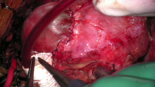 The decision was made to proceed with a repeat operation. Intraoperative bronchoscopy was performed and showed significant tracheobronchial compression. The procedure was performed on a beating heart and included bilateral reduction branch pulmonary arterioplasties and PV replacement with a bioprosthesis. The authors felt that a modified Lecompte maneuver with anterior translocation of the right PA was necessary to relieve the significant airway compression.