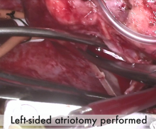 Intraoperatively, the patient’s left pulmonary veins were more anterior than the left pulmonary artery. The right pulmonary artery was posteriorly-directed, rendering the lateral tunnel option not possible. An extracardiac conduit was also not ideal given the position of the inferior vena cava (midline). Placing an extracardiac conduit would have left the cardiac mass to rest directly on top of the conduit, likely causing obstruction. Creation of a posterior tunnel (created from Gore-Tex patch) appeared to be the best option. The inferior portion of the tunnel incorporated the inferior vena cava and atrial septum. The connection with the pulmonary artery was created by incising across the dome of the left atrium, across the atrial septum, and across the right atrium. The inferior portion of this incision was sutured to the inferior portion of the transverse incision from the left pulmonary artery to the right pulmonary artery (just below bidirectional Glenn anastomosis). The superior portion of the tunnel was sewn to the superior portion of pulmonary arteriotomy. The lateral aspect of the tunnel incorporated the atrial septum.