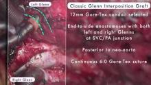 At four years, three months of age, patient underwent a pre-Fontan catheterization. Despite multiple modalities of imaging (2D and cross-sectional imaging with 3D reconstructions), exact Fontan strategy was unclear. Intraoperatively, the patient underwent a posterolateral tunnel Fontan, centralization of bilateral classic Glenn shunts, translocation of the right upper pulmonary vein, and right atrial reconstruction. Centralization of the bilateral classic Glenns was made possible by extensive dissection and opening of the posterior pericardium to allow space for the interposition graft to lay without compression of the left coronary artery. The right upper pulmonary vein was translocated to allow use of the right atrial free wall for posterolateral tunnel incorporation. The patient had a relatively uneventful postoperative course and is doing well as an outpatient.