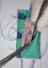 The patch consisted of two layers: an inferior layer and a superior layer, which were connected to each other to form a three-dimensional structure similar to an open-mouthed pocket. The shape of each layer represents either a half-circle or half-oval. The opening of this structure was sutured to the wall of the right atrium.