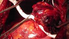 This is the case of a 59-year-old woman affected by B3/C thymoma. Chemotherapy was complicated by hematological disorders and discontinued after two cycles. She had a partial response to radiotherapy prior to surgery. She then underwent median sternotomy, off-pump left innominate vein reconstruction with an 8 mm Dacron graft, and SVC reconstruction with a 12 mm Dacron graft. On postoperative day two, the SVC graft was revised because of thrombosis. The authors performed Fogarty catheterization of the right jugular and subclavian vein, but subsequently replaced the SVC graft with a 16 mm Dacron graft. The pathologist reported an R0 resection of the thymic cancer.