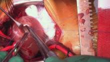 Using a combination of sharp dissection with Potts scissors and blunt peeling of the mass, the tumor is enucleated from the left ventricular cavity. Next, the integrity of the mitral valve, its subvalvular apparatus, and the aortic valve are checked. The left ventricular apical incision is then closed in two-layer fashion. The heart is then de-aired, and the aortic cross-clamp is removed. One thing of note, the atrial level shunt is closed subtotally.